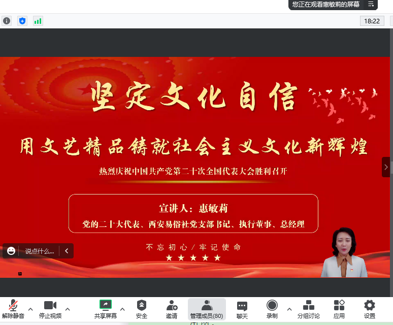 11月2日,国际部(院)党支部邀请党的二十大代表、著名秦腔表演艺术家、西安易俗社党支部书记惠敏莉作了题为“坚定文化自信,用文艺精品铸就社会主义文化新辉煌”线上专题报告。报告会由国际部(院)党支部书记任惠莲主持,国际部(院)全体教职工参加。会上,惠敏莉围绕加强党的建设、推动中华文化更好走向世界、加强人才国际交流、全面推进中国特色大国外交等方面对党的二十大精神进行了深刻的解读和阐释,并以真切情感生动讲...