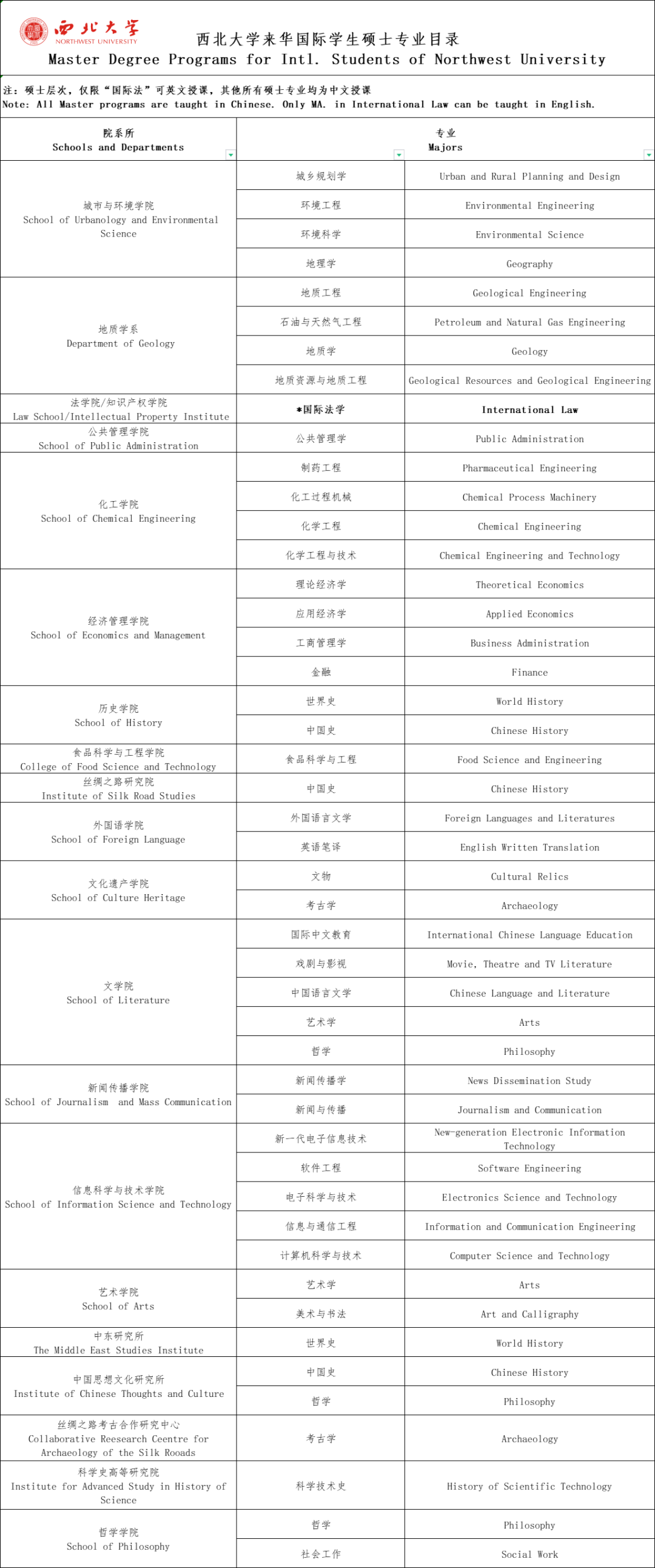 国际学生硕士研究生招生专业列表