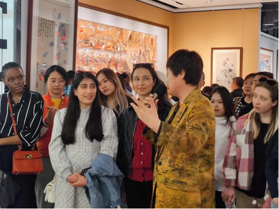 同学们首先来到武功县馨绣民间手工布艺开发有限公司参观学习。咸阳市非物质文化遗产保护传承人、总经理计清女士带领大家参观了他们团队设计、研发、制作的刺绣精品,详细介绍了这些作品中展现的“福”“寿”“喜”等中国传统文化习俗的内涵以及绣女们几十年如一日用一针一线精心打磨刺绣精品的坚韧和毅力。展厅的每一幅作品都给人以视觉上的盛宴和心灵的震撼,让大家对新时代大国工匠精神有了新的感悟和认识。国际学生们在绣坊现场观摩并体验了中国刺绣工艺的精妙之处,并兴趣盎然地讲述了中国的文化习俗与自己国家的异同之处。