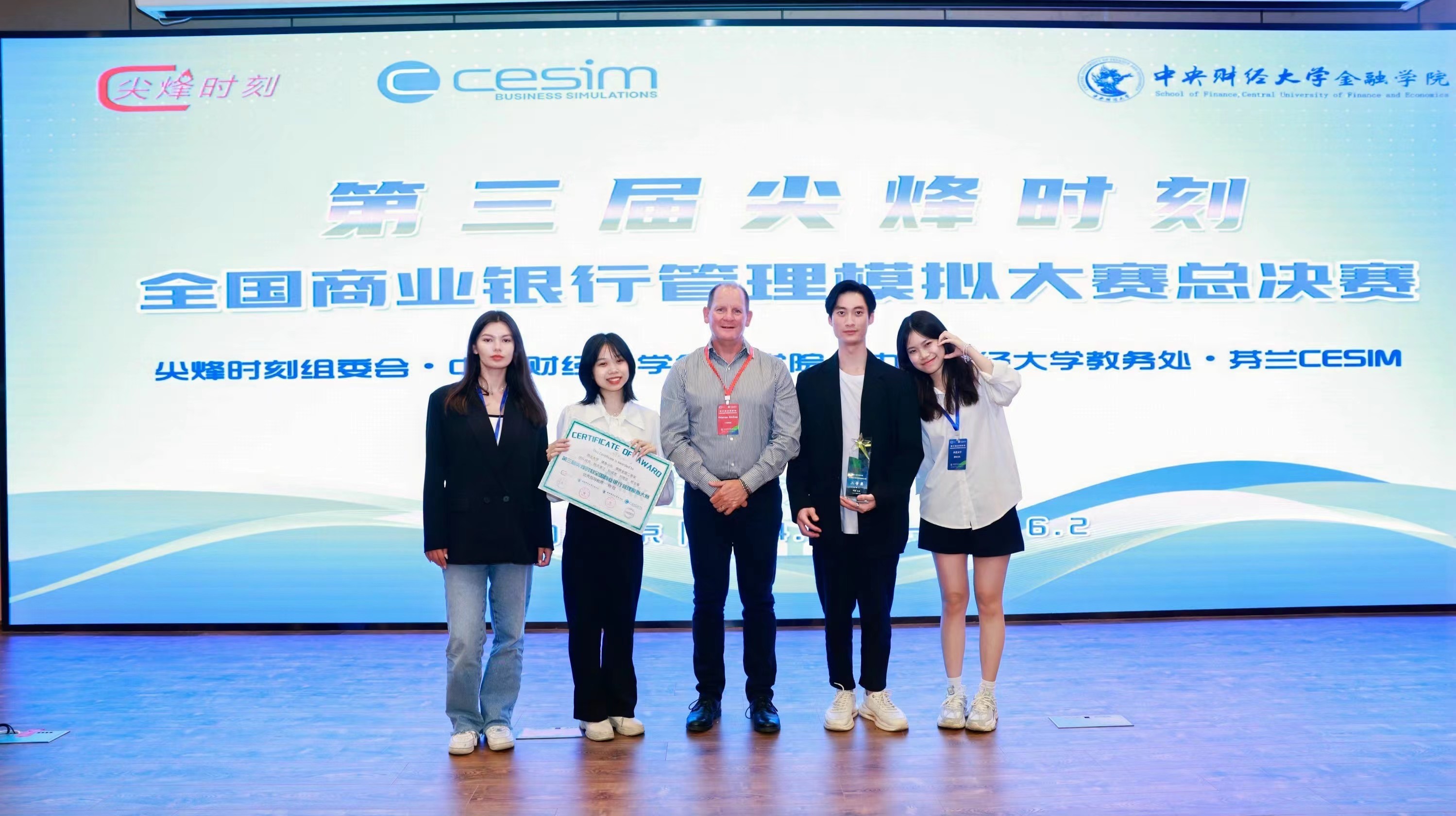 2024年6月2日,第三届尖烽时刻全国商业银行管理模拟大赛决赛在北京圆满落幕,我校由56net亚洲必赢手机教师杨煜指导,阮氏茶江(越南)、阮成忠(越南)、刘塔亚(哈萨克斯坦)、桥宝春(越南)等4名国际学生组成的参赛代表队获二等奖。本届大赛由尖烽时刻组委会、中央财经大学与芬兰 CESIM 联合主办,共有来自全国多所高校的80支团队报名参赛,经过为期一周的线上多回合激烈角逐,28支团队进入总决赛,通过线上6个回合的决策模拟、线下英文团队介绍及商业展示案例等环节进行了深度交流。