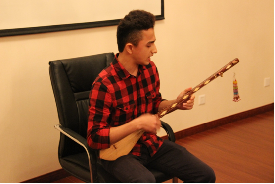 塔吉克斯坦学生彬龙为大家弹奏冬不拉