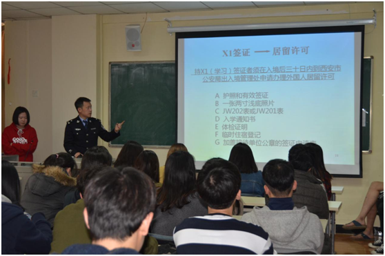 新生入学教育是留学生们来华的第一课,留学生管理办公室的老师精心制作了PPT,详细讲解了学校情况、新生入学须知及西北大学外国留学生管理的规章制度,结合以前出现的突发事件和案例,提醒新生们注意遵守法律法规和学校的各项规定。在学校的新生入学讲座之后,留学生管理办公室又邀请西安市出入境管理处的警官分语种专门为新生们做出入境管理法讲座,让新生们在第一时间了解办理签证、临住登记注意事项以及外国人在华应知道的法律知识,为留学生们顺利在华学习、生活打下了良好基础。