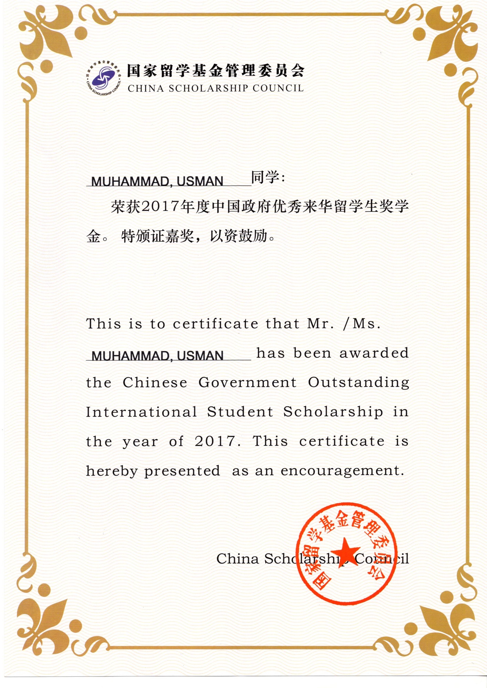 近日,全国2017年“优秀来华留学生奖学金”项目评比结果揭晓,,经相关专家严格筛选和国家留学基金委员会的评比,我校巴基斯坦留学生USMAN MUHAMMAD荣获2017年“优秀来华留学生奖学金”,也是我校第二位荣获该项荣誉的留学生。该项奖学金2017年全国开放名额为185个。