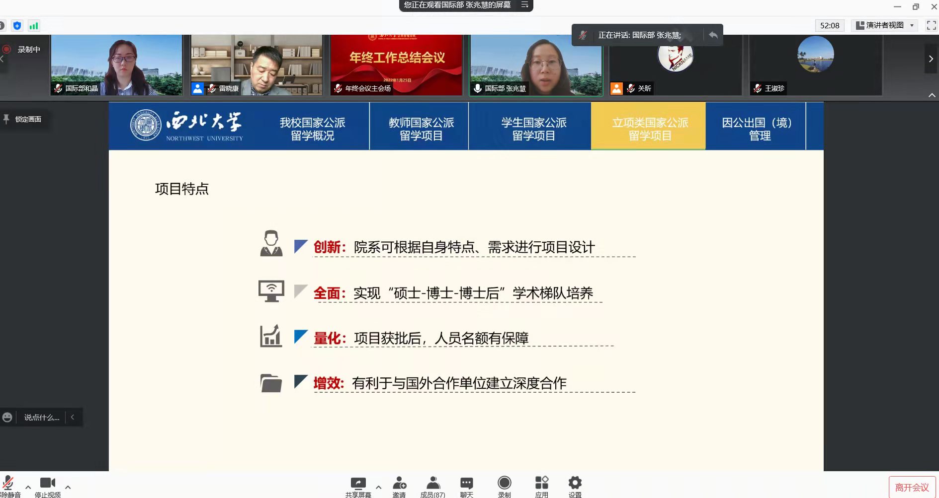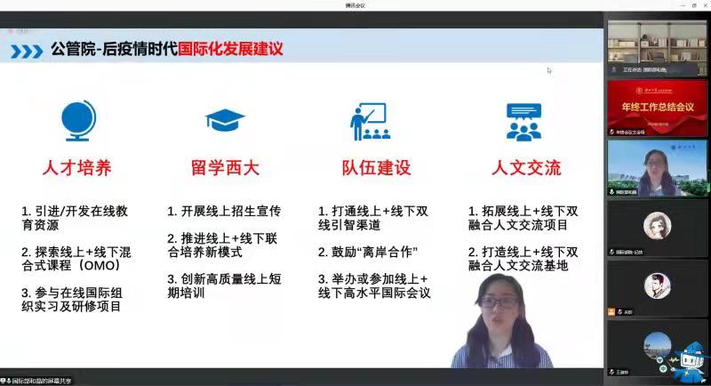 1月25日上午,国际部(院)国际项目管理办公室、出国管理办公室、合作办学办公室和国际学生招生办公室负责人在张熠副院长的带领下,为公共管理学院全体教职员工进行2022年首场线上国际化相关工作宣讲。