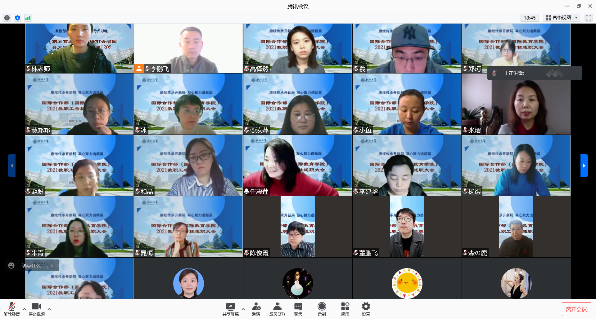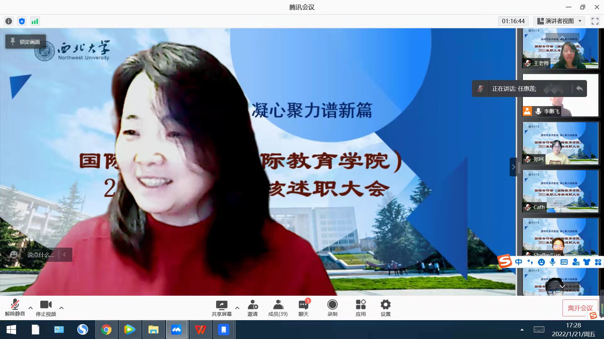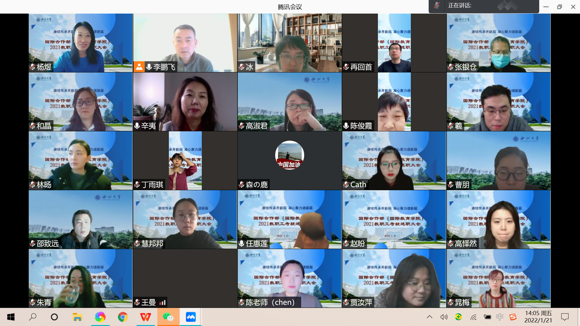 随后,38名教职员工在线上通过共享屏幕展示PPT的方式依次述职,作个人年度工作汇报。大家在总结2021年时能注意围绕亮点和创新工作汇报,在谋划2022年工作时能注重规划的前瞻性和可行性。通过认真聆听他人的年终总结汇报,加强了教职工彼此的学习互鉴,促进了相互的交流沟通。