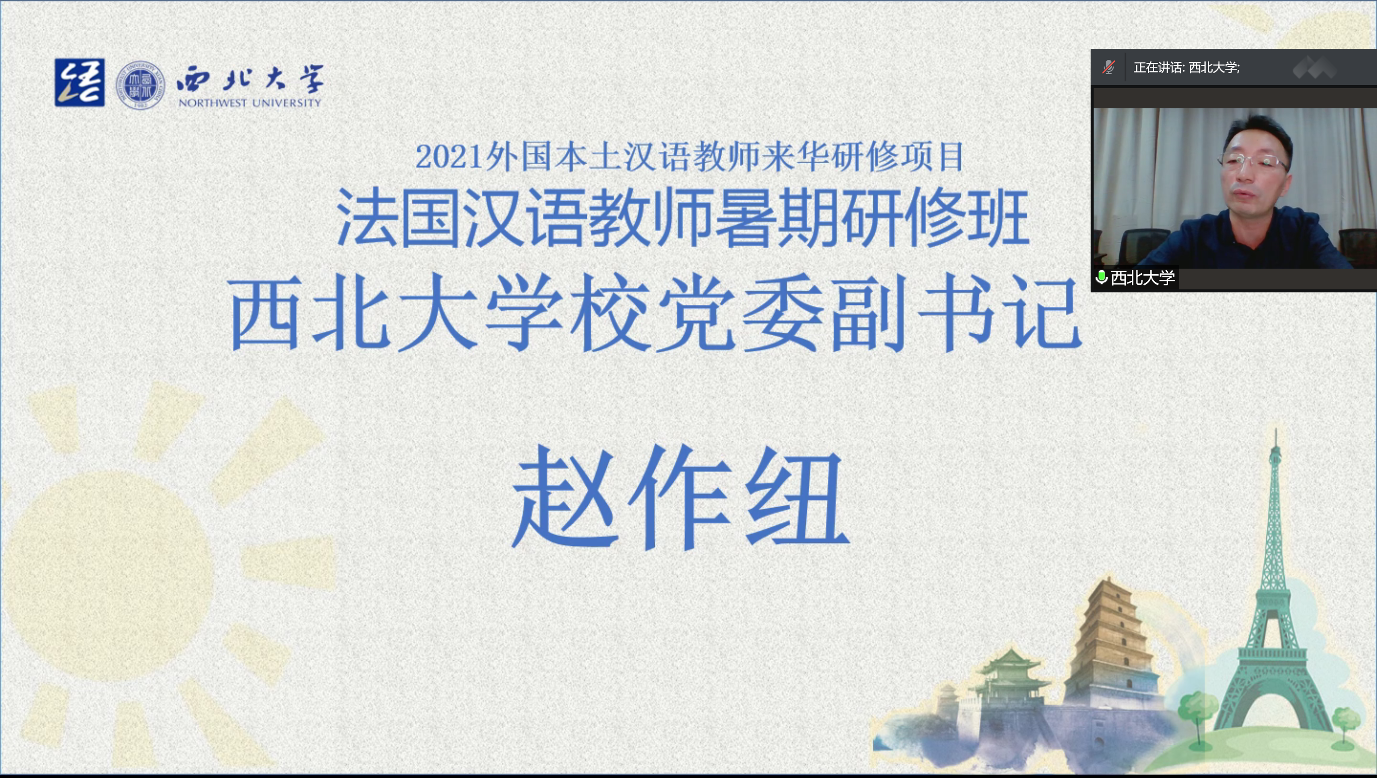 西北大学赵作纽副书记介绍了学校为筹备此项培训所做的工作。他在讲话中高度评价了白乐桑教授和法国汉语教学协会及汉语教师们在传播汉语和中国文化方面所做的努力,希望此次研修项目能在帮助教师们不断提高汉语教学能力的基础上,进一步促进法国汉语教师与国内专家学者的交流与合作,为共同探索疫情时期汉语国际教育事业发展的新方式、新道路而共同努力。