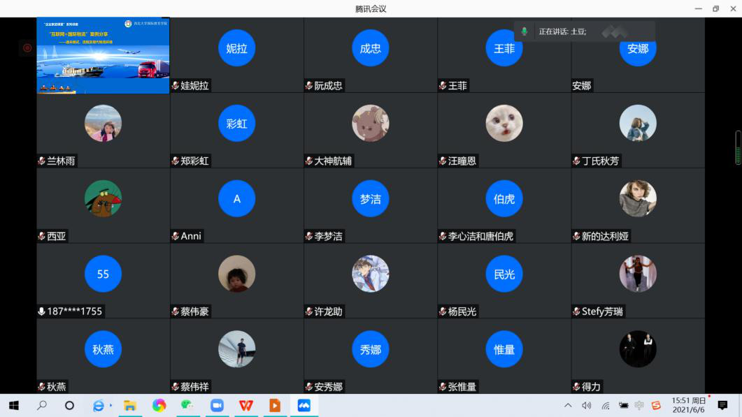 6月6日下午,我院面向国际经济与贸易专业国际学生的“企业家进课堂”系列讲座之“互联网+国际物流”案例分享会在线上进行。讲座邀请了喀什启路国际贸易公司的国际物流经理魏宁作为分享嘉宾,30余名国贸专业本科国际学生参加了交流,会议由杨煜老师主持。