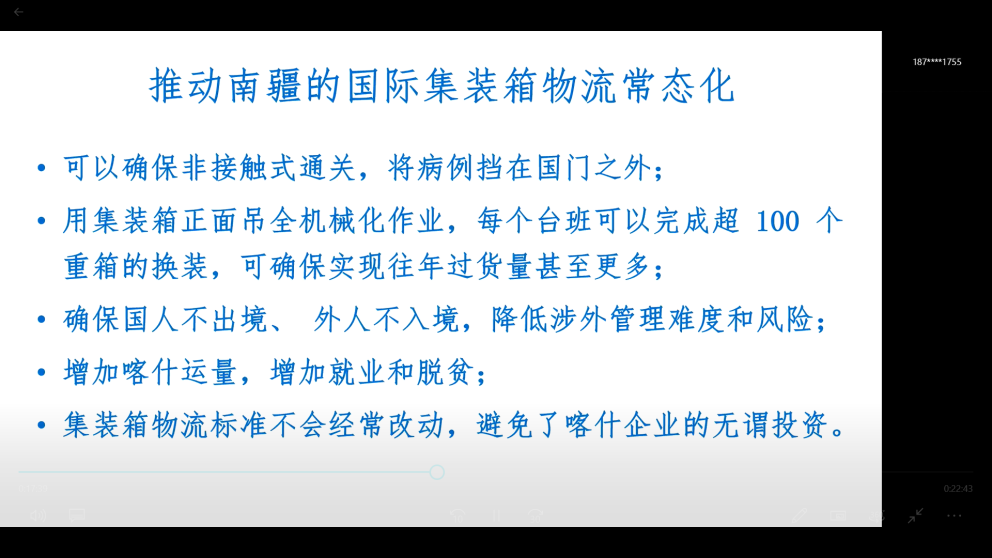 魏宁经理结合个人职业发展历程及物流公司的具体运营方式,讲述了中国-中亚国际公路物流的实际情况,具体介绍了综合保税区涉外物流的通关模式、流程以及现代国际物流环境。特别指出,在全球疫情防控期间,非接触式通关、全机械化大幅度提高重箱的换装效率等物流作业中的创新升级,对于国际物流有强大的推动作用。最后,魏经理向同学们展示了在建中及拟建的中国连接中亚南亚国家的部分物流工程规划示意图。