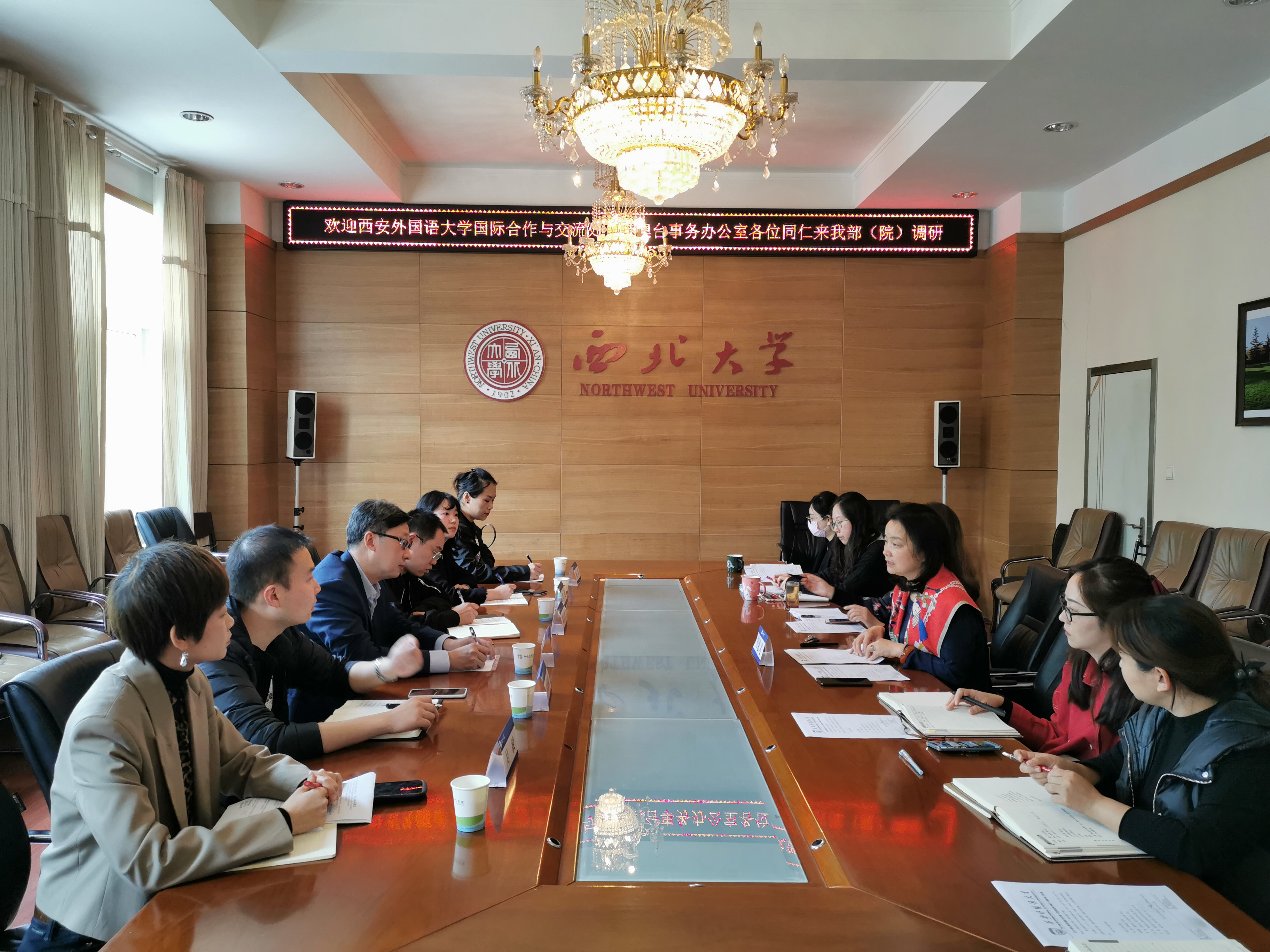 4月27日下午,西安外国语大学国际合作与交流处处长景楠一行6人来我部调研,任惠莲部长(院长)及相关科室负责人共参加了座谈。