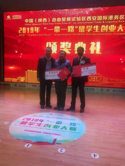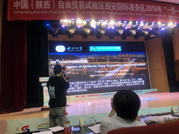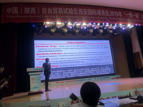 2019年12月8日,西安国际港务区2019“一带一路”留学生创业大赛决赛在西安国际港务区管理委员会大楼隆重举行,本次大赛共有16个项目晋级决赛,西北大学博士生穆基同学与他的导师白泉老师以标题为“基于高容量温敏亲和色谱的抗体药物分离纯化新技术”,在演讲与答疑环节脱颖而出,并最终以综合分90分的成绩拿到了全场第二名的好成绩,白老师获得了优秀指导老师奖,我校获得优秀组织奖。