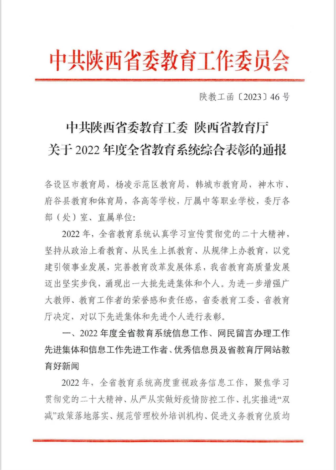 近日,中共陕西省委教育工委、陕西省教育厅下发了《关于2022年度全省教育系统综合表彰的通报》(陕教工函[2023]46号),西北大学国际合作部(56net亚洲必赢手机)获评“2022年度陕西教育系统外事(港澳台)工作先进集体”荣誉称号,56net亚洲必赢手机部长(院长)任惠莲荣获先进个人。