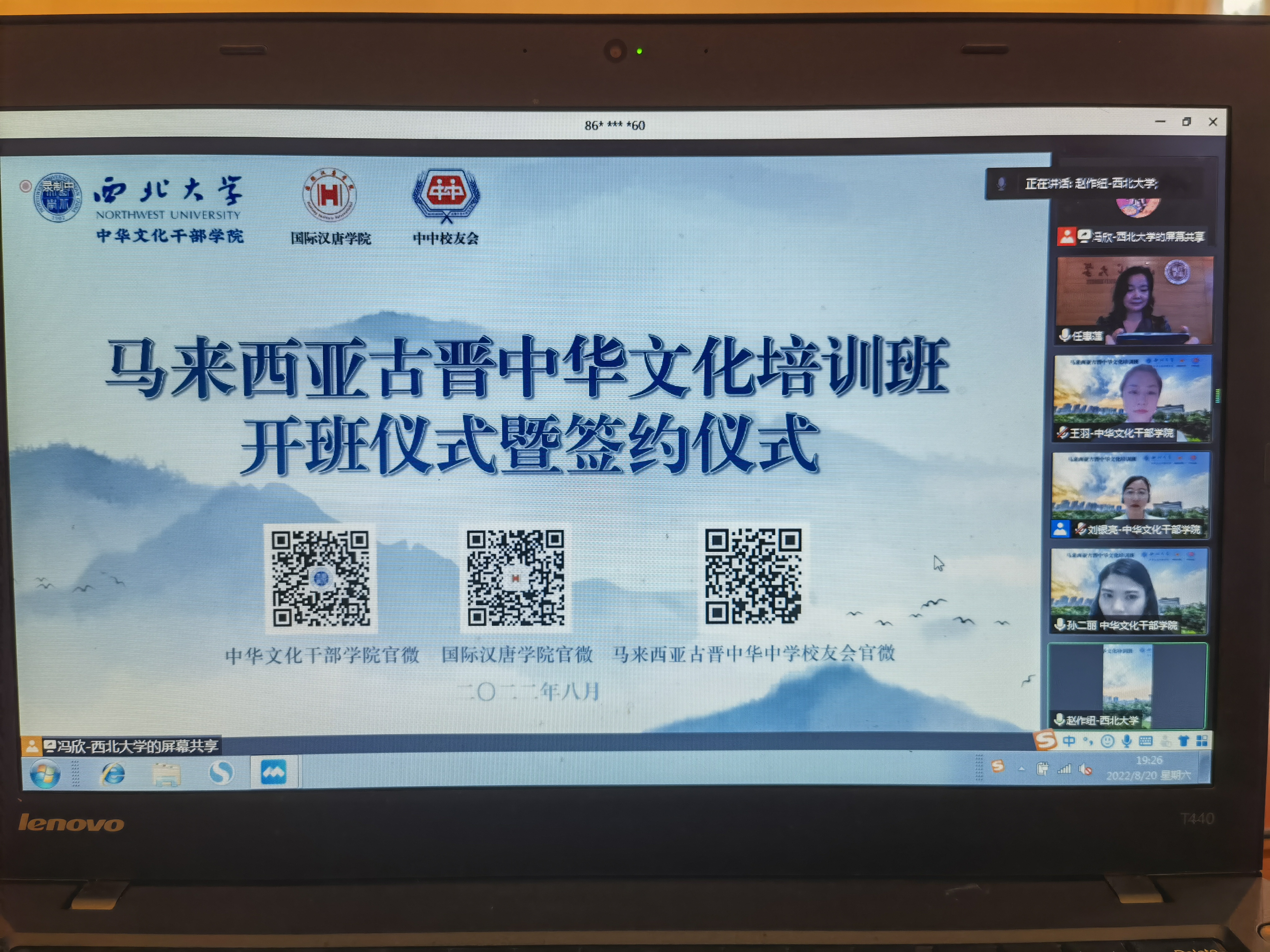 8月20日晚,由西北大学国际汉唐学院、中华文化干部学院、马来西亚古晋中华中学校友会联合举办的马来西亚古晋中华文化线上培训班开班仪式暨签约仪式顺利举行。中国驻古晋总领事馆总领事邢伟平,马来西亚古晋中华中学校友会会长、我校客座教授、拿督黄国辉,校党委常委、副校长赖绍聪出席线上开班仪式暨签约仪式,培训班全体学员近400人参加。仪式由校党委副书记、中华文化干部学院院长赵作纽主持。