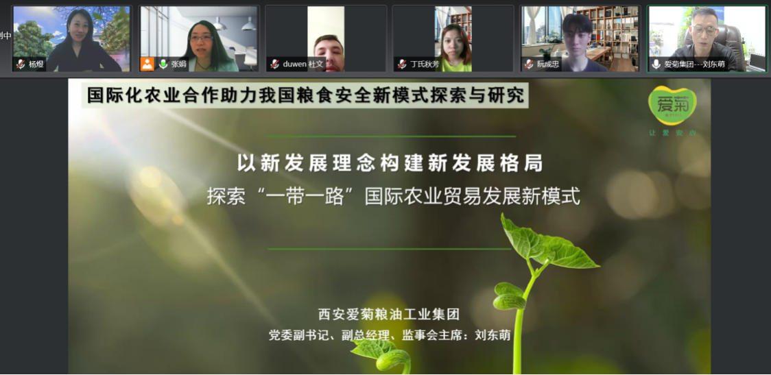 2022年5月11日下午,我院举办面向国际经济与贸易专业国际学生的“企业家进课堂”线上讲座。讲座邀请了西安爱菊粮油工业集团党委副书记、副总经理刘东萌分享“以新发展理念构建新发展格局——探索‘一带一路’国际农业贸易发展新模式”的报告。40余名国贸专业本科国际学生参加了交流。