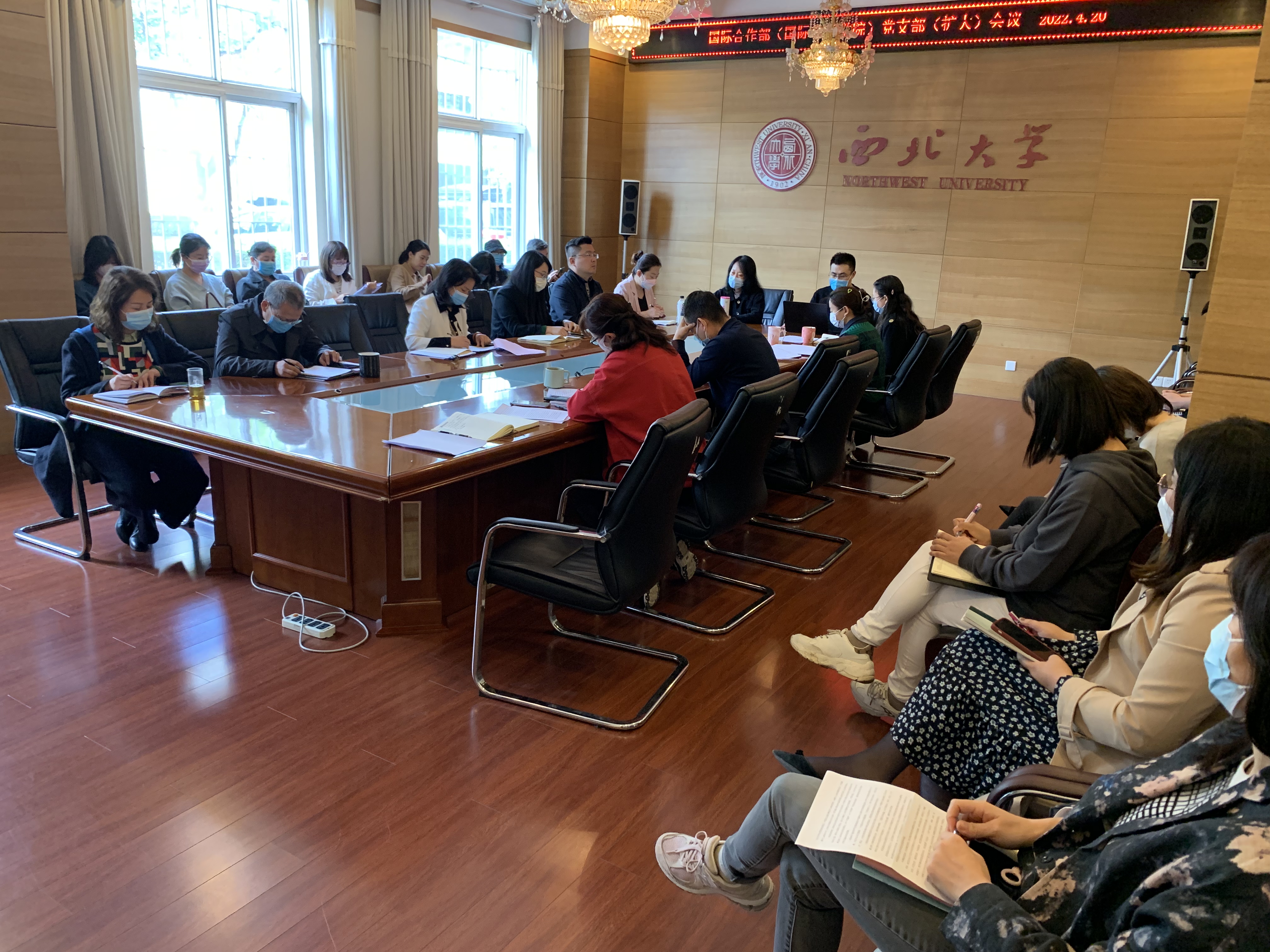 4月20日下午,56net亚洲必赢手机党支部在太白校区召开扩大会议,学习习近平外交思想相关内容并研讨重点项目推进工作。会议由党支部书记任惠莲主持,部(院)全体教职工参加。