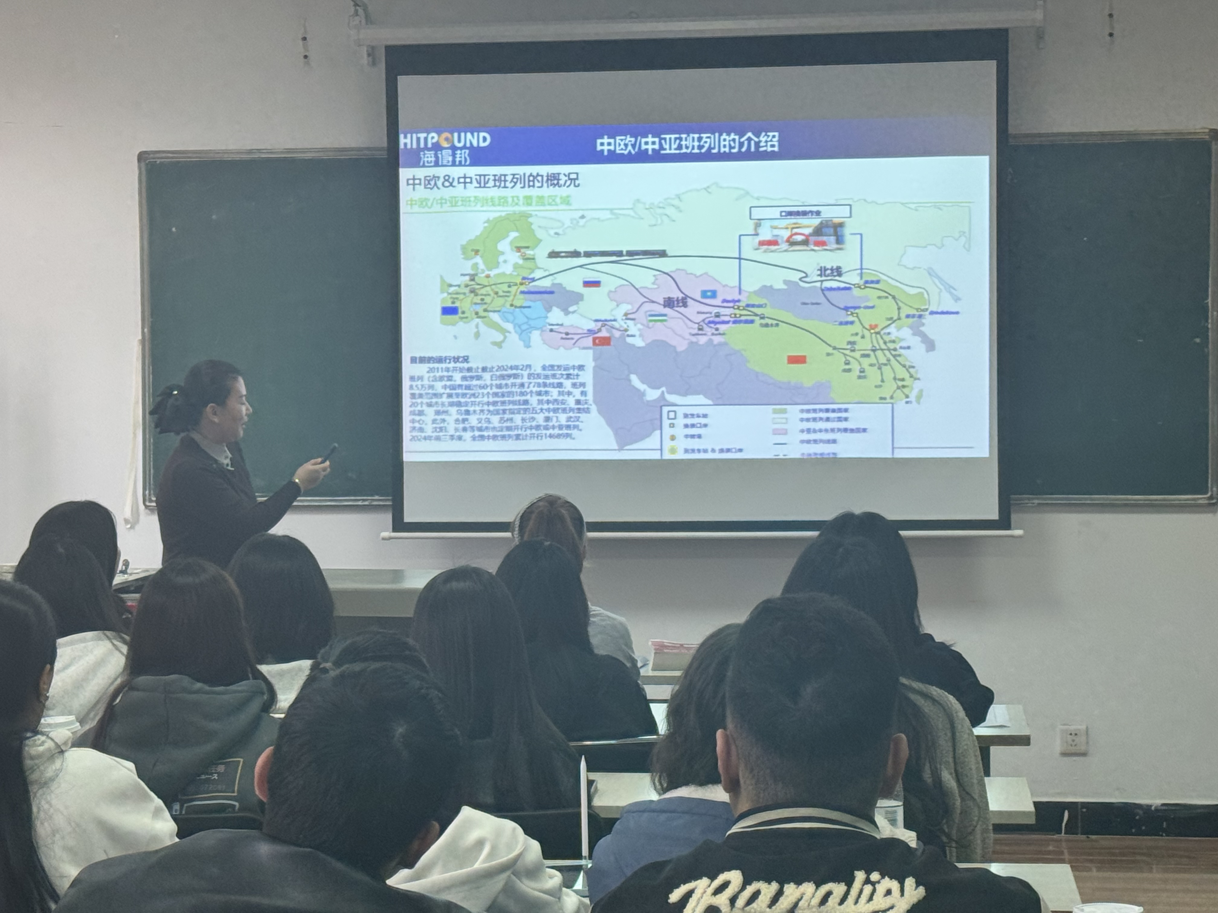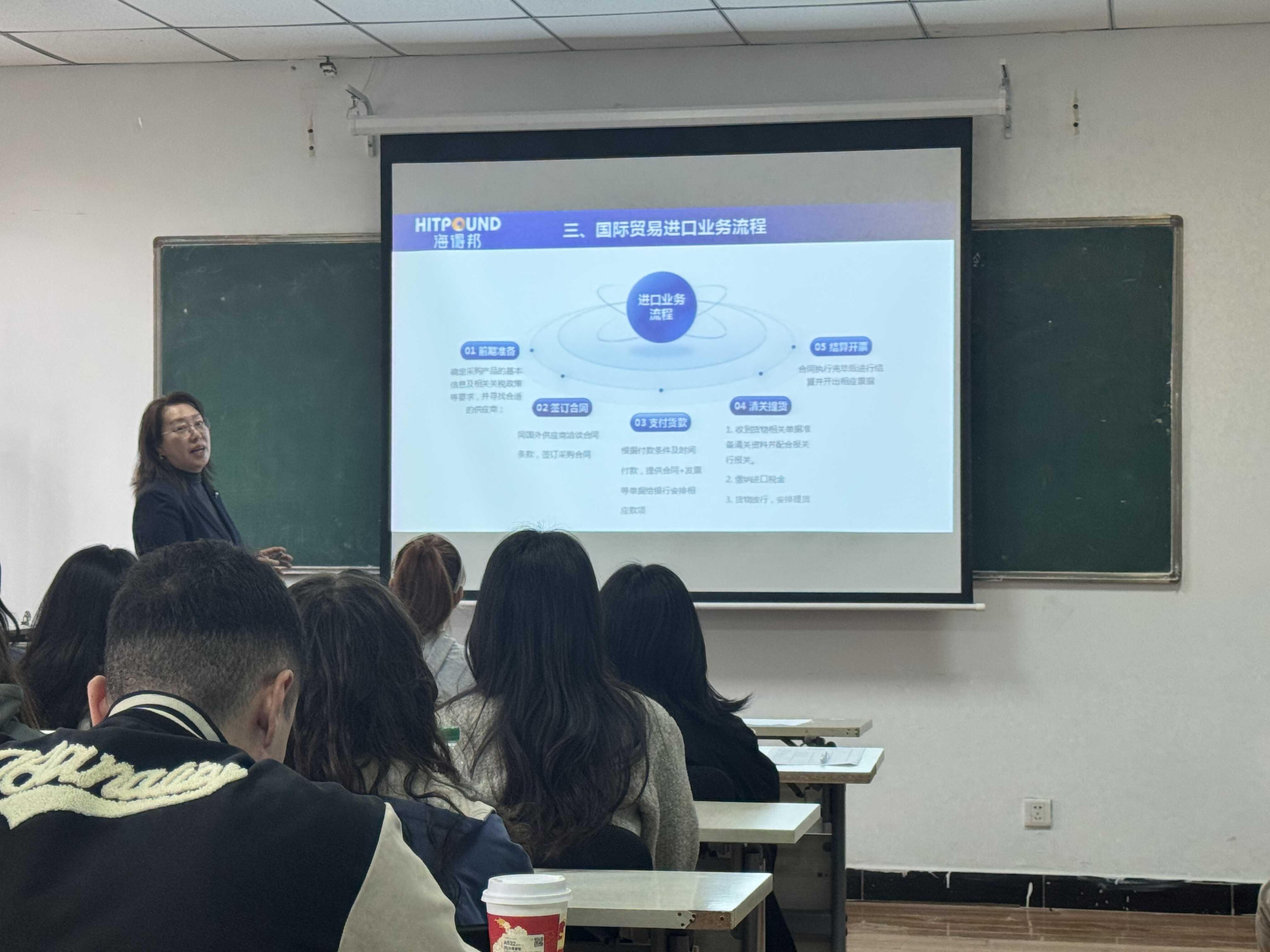 陕西金辉恒润商贸有限公司石玲总经理以国际贸易相关理论概念为引入,结合海得邦集团业务实例分享了进出口业务的整个业务流程与注意事项,并融入相关国际贸易政策的解读,将自己丰富的国际贸易从业经验分享给学生们。