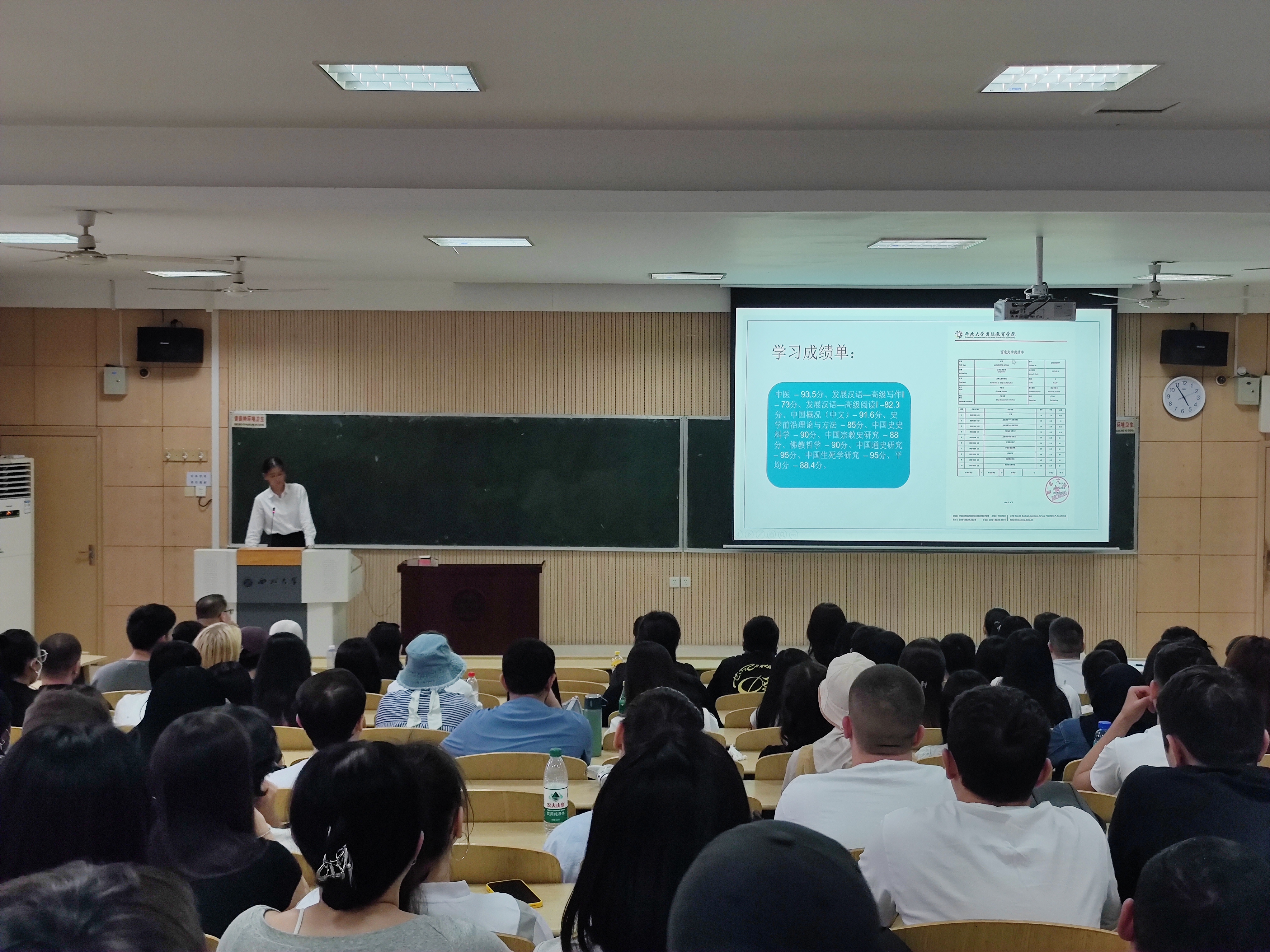 会议开始,任惠莲对本年度的奖学金评审进行总结,她对各位同学一年以来在课程学习、学术深耕、驰骋赛场、文化交流、志愿服务、国际传播等方面的努力表示肯定。同时也强调,学校与学院始终坚守立德树人根本任务,全面落实“全员、全过程、全方位”的育人体系,营造良好的学术环境,强化校园安全保障与管理服务,打造各类文化交流品牌活动。最后,她对所有奖学金生提出三点希望,希望同学们成为终身学习的践行者,争做开放包容的倡导者,甘当责任担当的表率者。