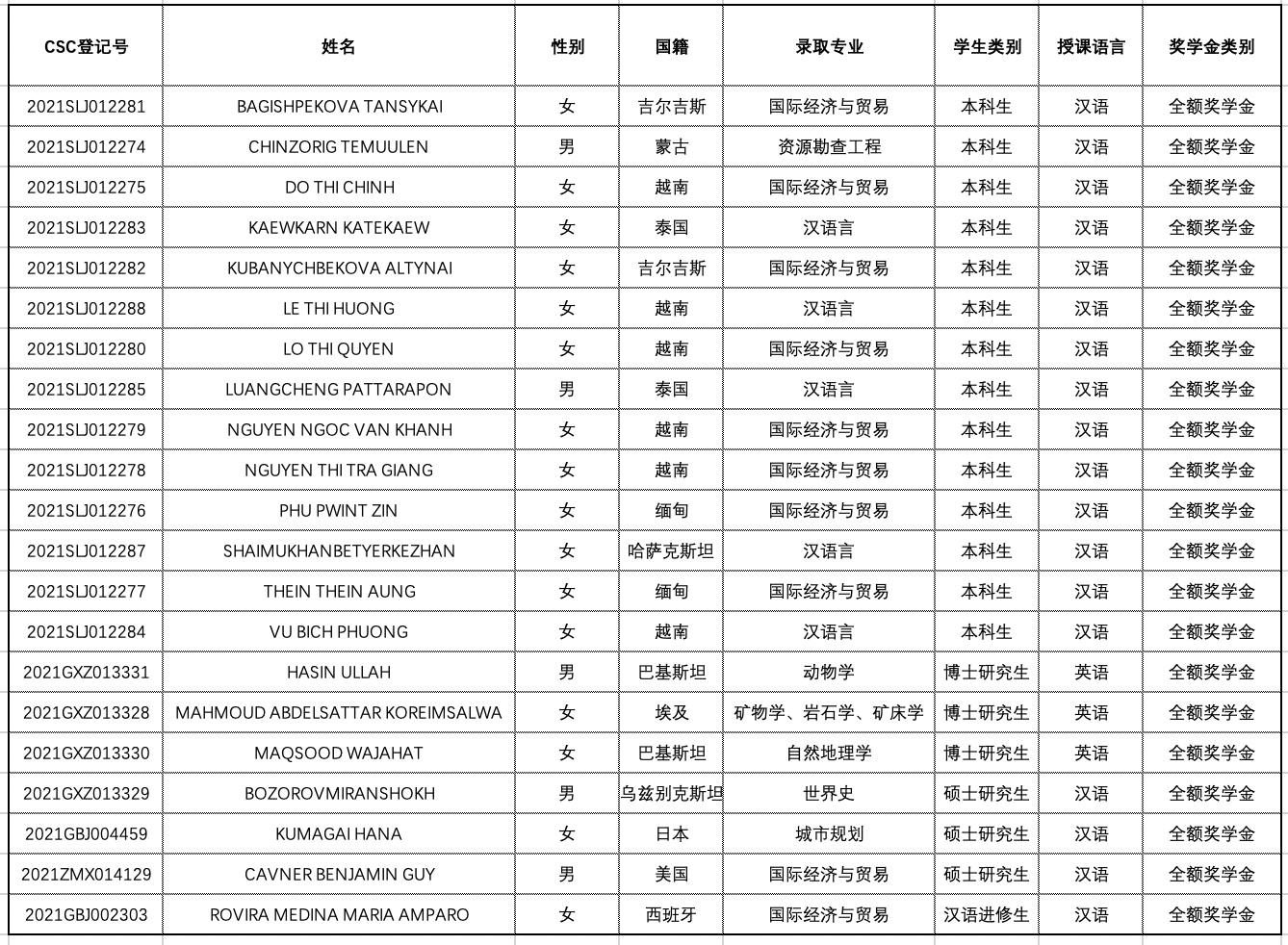 2021-2022学年度西北大学中国政府奖学金拟录取名单公示