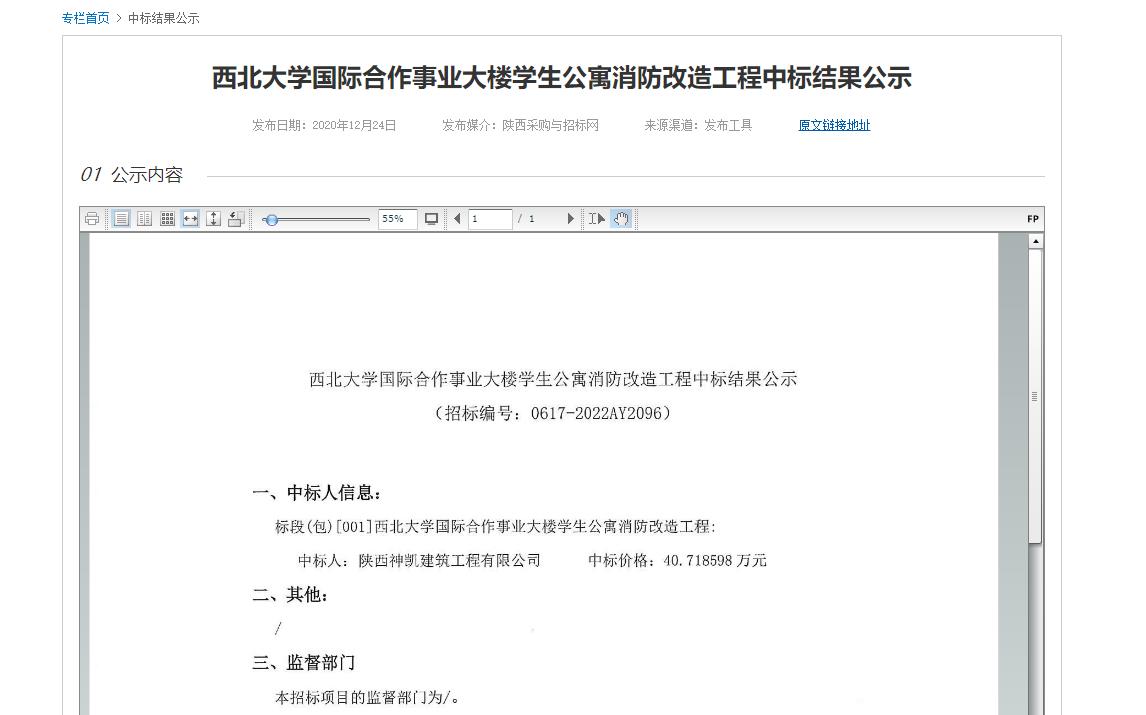 西北大学国际合作事业大楼学生公寓消防改造工程中标结果公示