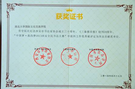 为了让留学生进一步感受中国优秀传统文化,亲身体验中国书法的魅力。我院近期组织留学生参加“中国梦·我的梦”2013西安全民书法大赛活动。西北大学国际文化交流学院被评为“突出贡献奖单位”。来自韩国、比利时、美国等国的留学生参加了比赛。 “中国梦·我的梦”2013西安全民书法大赛活动为庆祝三秦都市报社创刊20周年、西安市书法家协会成立30周年,由三秦都市报社、西安市书法家协会、中国书法品评网联合举办。
