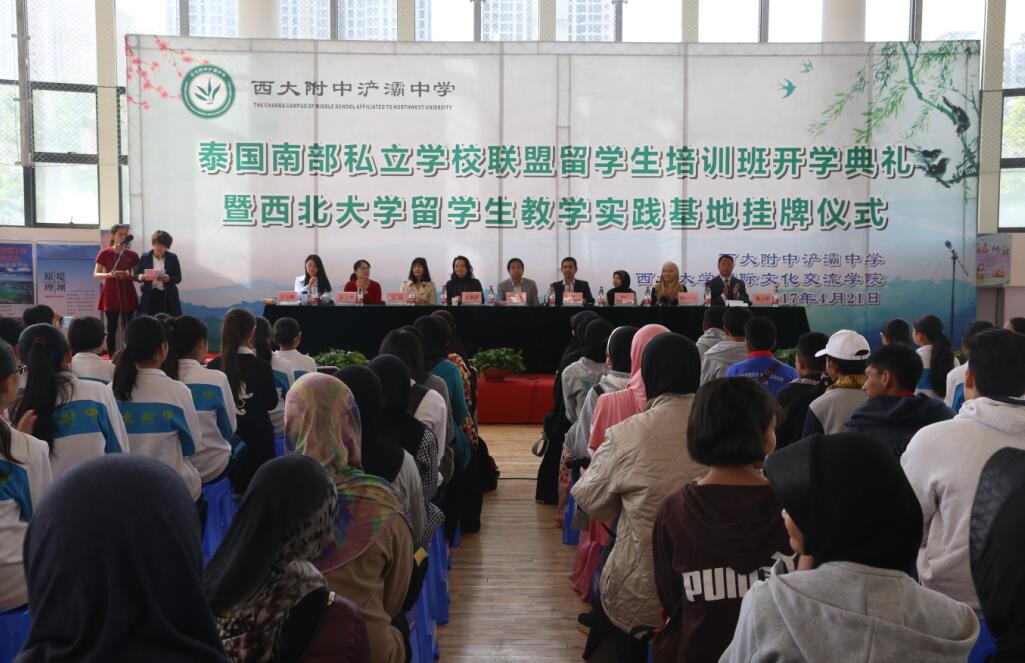 4月21日上午,西北大学留学生教学实践基地挂牌仪式暨泰国南部私立学校联盟留学生培训班开学典礼在西大附中浐灞中学举行。我校党委副书记、副校长贾明德,任惠莲院长及学校相关部门、附中浐灞中学师生代表出席活动。 仪式上,贾明德为“西北大学留学生教学实践基地”揭牌。泰国南部私立学校联盟和我校附中浐灞中学负责人分别就两校的情况做了介绍。 在泰国南部私立学校联盟留学生培训班开学典礼期间,中、泰两国学生进行了精彩的才艺...