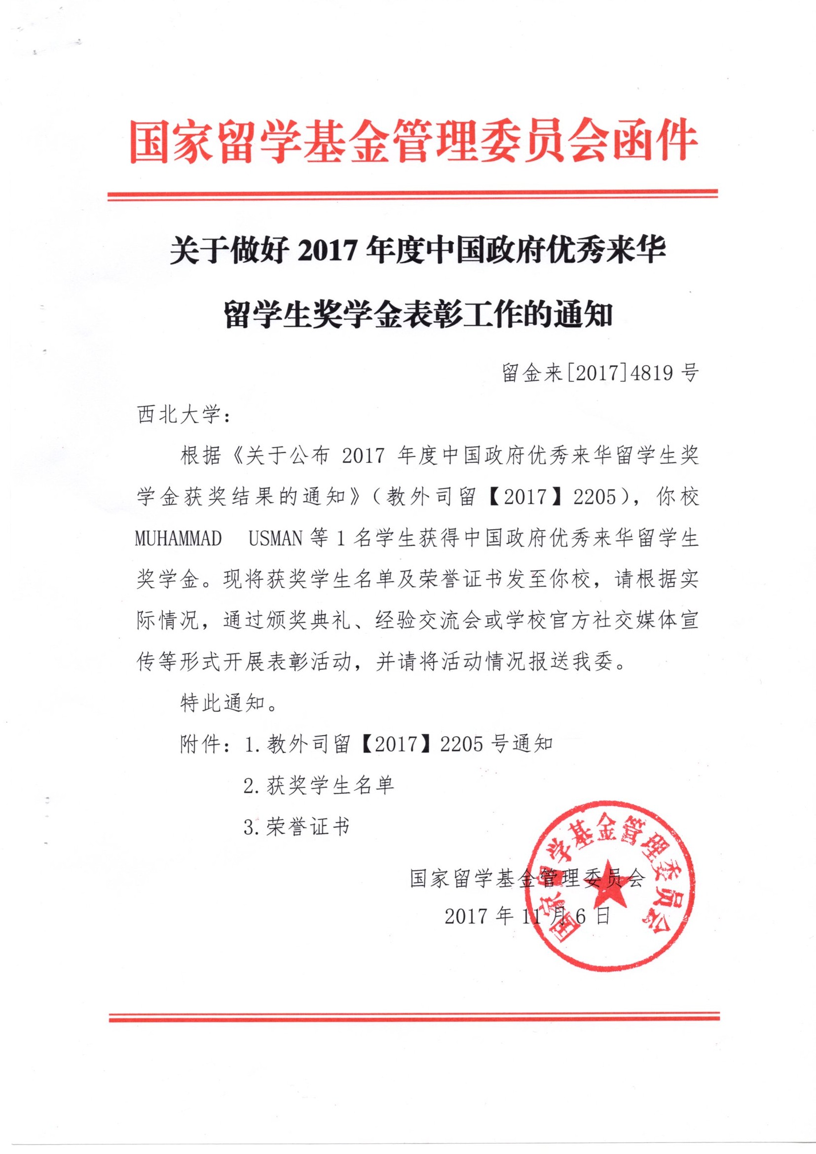 近日,全国2017年“优秀来华留学生奖学金”项目评比结果揭晓,,经相关专家严格筛选和国家留学基金委员会的评比,我校巴基斯坦留学生USMAN MUHAMMAD荣获2017年“优秀来华留学生奖学金”,也是我校第二位荣获该项荣誉的留学生。该项奖学金2017年全国开放名额为185个。 USMAN MUHAMMAD,我校招收的第一位英文授课博士,2014年9月至2017年7月在化学与材料科学学院有机化学专业学习,获得理学博士学位。该生在校期间表现优秀,先后荣获2...