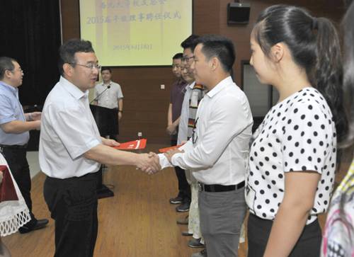 6月18日下午,我校校友总会2015届年级理事聘任仪式在长安校区举行,179名毕业生被聘任为年级理事。我校副校长高岭,学校相关部门和院系负责人,各毕业班辅导员及全体年级理事参加了仪式。 会议宣读了“校友总会致2015届毕业生的一封信”和年级理事名单,与会领导为理事代表颁发了聘书。随后,来自文学院和信息科学与技术学院的杨佳宁、叶逸琛代表全体年级理事发言,他们饱含真挚情感,回忆起西大生活点点滴滴,流露出对母校的感恩和...